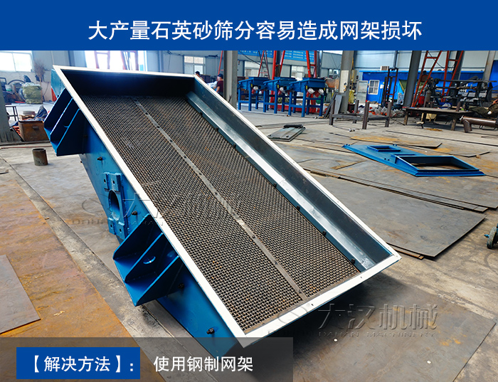 使用石英砂礦用振動(dòng)篩來進(jìn)行篩分時(shí),篩分的石英砂都會(huì)有一定的的重量,使用普通網(wǎng)架容易造成破損的問題,所以需要使用鋼質(zhì)網(wǎng)架來代替木質(zhì)網(wǎng)架,增加網(wǎng)架和篩網(wǎng)的承受能力,更換為鋼制網(wǎng)架的石英砂礦用振動(dòng)篩不僅換網(wǎng)比較方便,更可以延長篩網(wǎng)、篩機(jī)的使用壽命,鋼質(zhì)網(wǎng)架使用壽命比木質(zhì)網(wǎng)架長。
