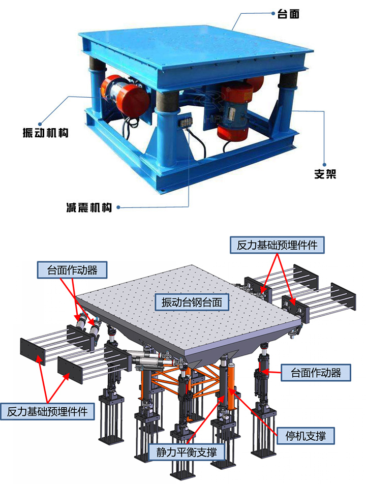 振動平臺主要有支架、臺面、振動機(jī)構(gòu),減震機(jī)構(gòu)四部分組成。