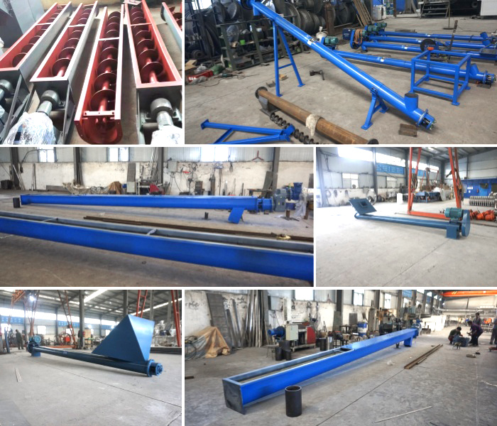 螺旋輸送機傾斜輸送,高度提升,料口采用料斗的試機形式,方便投料,防止撒料等優勢。